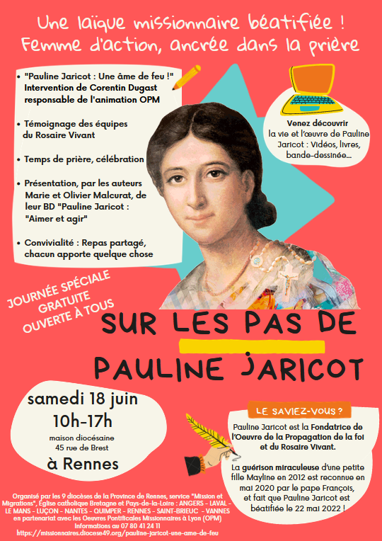 Les services de la Mission Universelle de l’Eglise de la Province de Rennes organisent le 18 juin de 10h à 17h à Rennes (à la Maison diocésaine 45 rue de Brest) une journée « Sur les pas de Pauline Jaricot », une centaine de personnes  y participeront pour tout savoir sur sa vie, son œuvre et sa béatification du 22 mai.