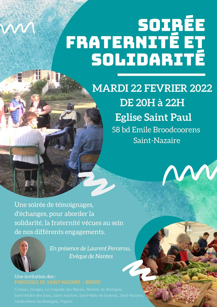 Affiche« Notre évêque Mgr Laurent Percerou est arrivé depuis un moment dans le diocèse, mais une bonne partie de ce temps a été marqué par les restrictions liées à la crise sanitaire. Il souhaite maintenant aller à la rencontre des diocésains, et pour cela il sera présent sur notre zone pastorale (Saint-Nazaire/Brière) * du 20 au 24 février 2022. Pendant ces journées, de nombreux rendez-vous sont prévus avec des chrétiens, des réalités économiques ou associatives locales, des élus…etc.